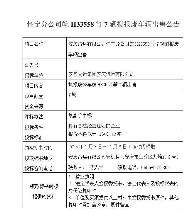 懷寧分公司皖H33558等7輛擬報(bào)廢車(chē)輛出售公告