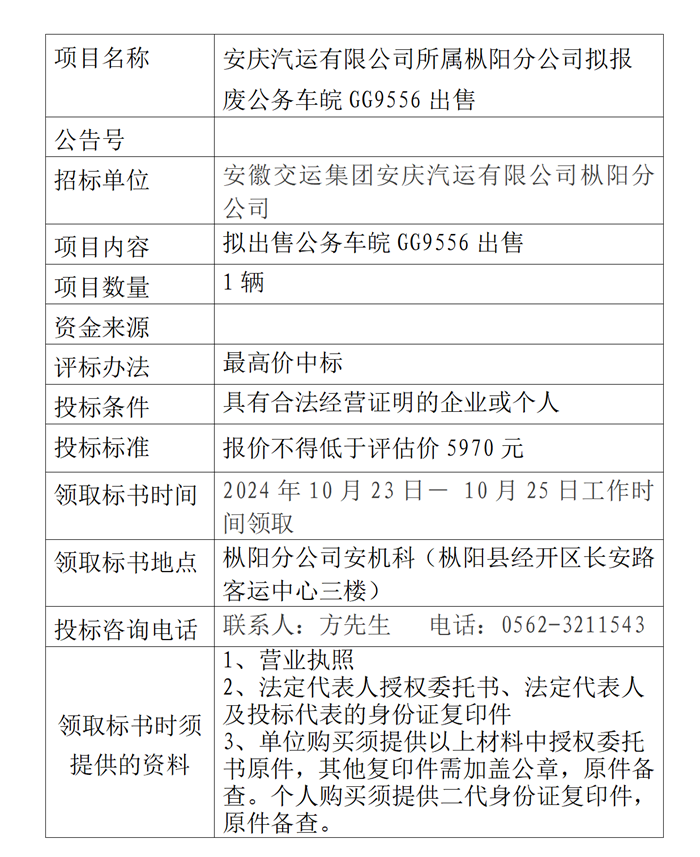 樅陽分公司擬報廢公務(wù)車皖GG9556出售公告